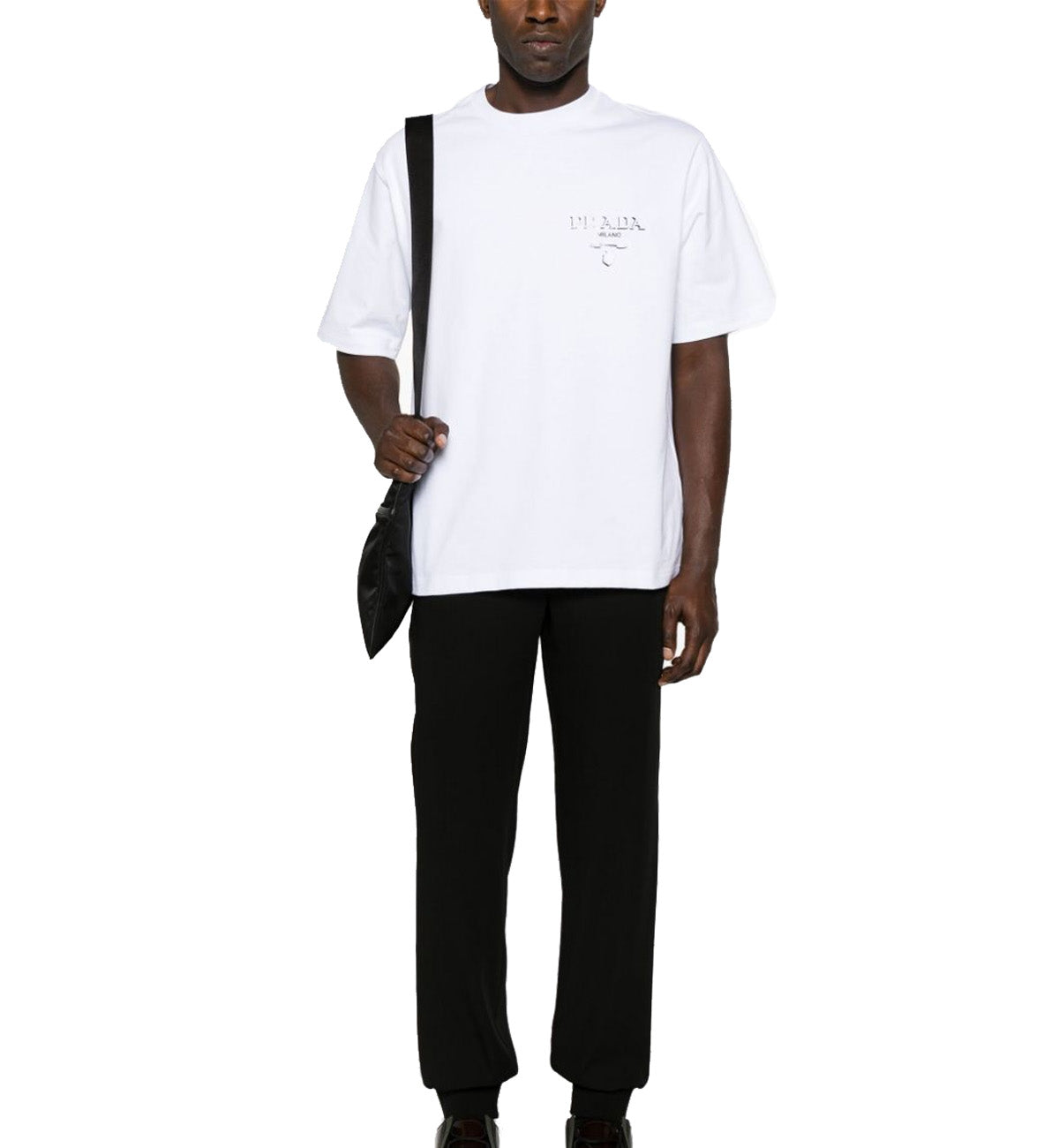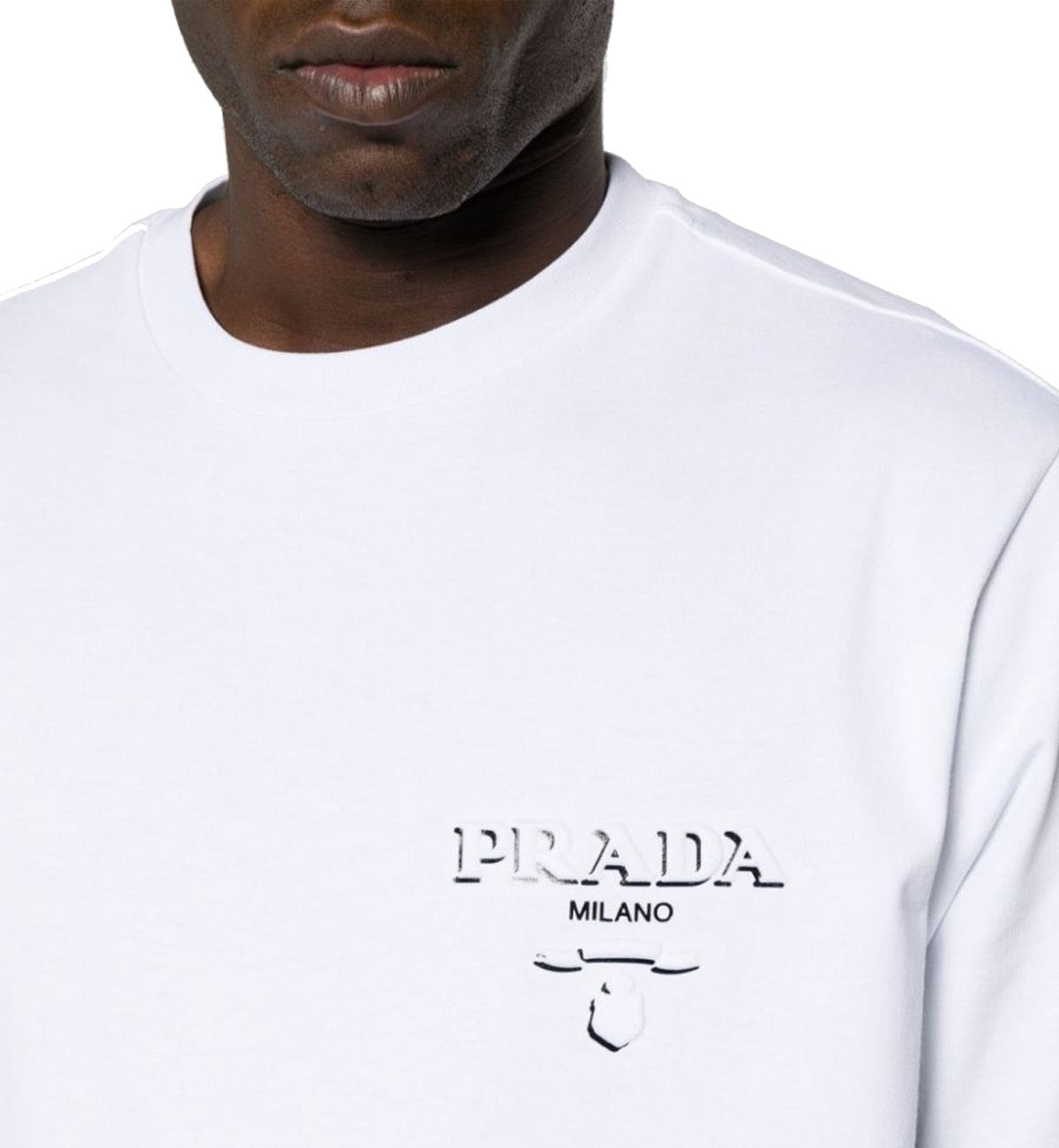 The Prada Milano Cotton T-Shirt in Black is the epitome of effortless luxury and understated style. Crafted from premium cotton, this t-shirt offers supreme comfort and a soft touch against the skin. The classic white hue provides a versatile canvas for Prada's iconic triangle logo, subtly embroidered or printed on the chest, adding a touch of sophistication to your casual look.
