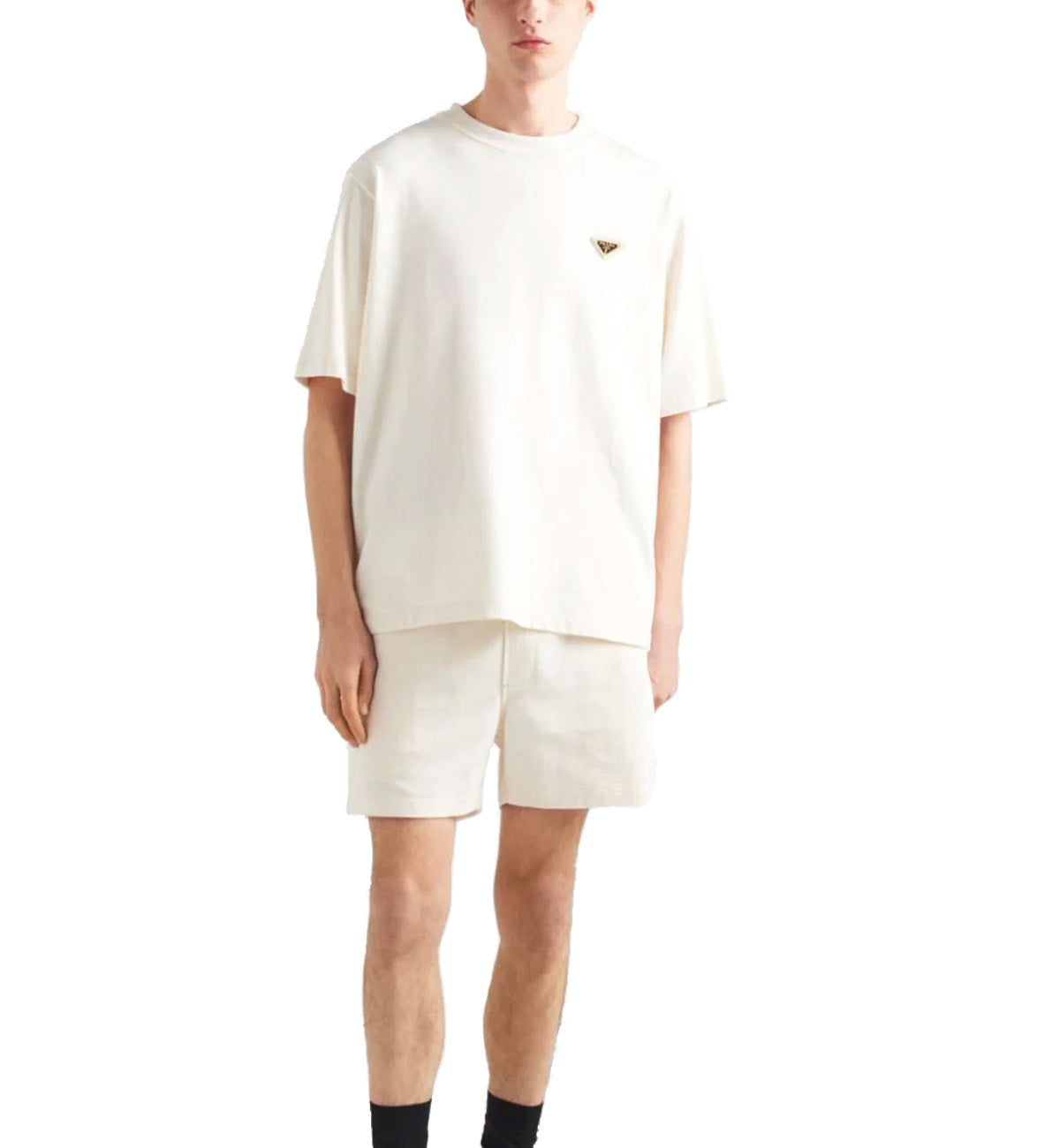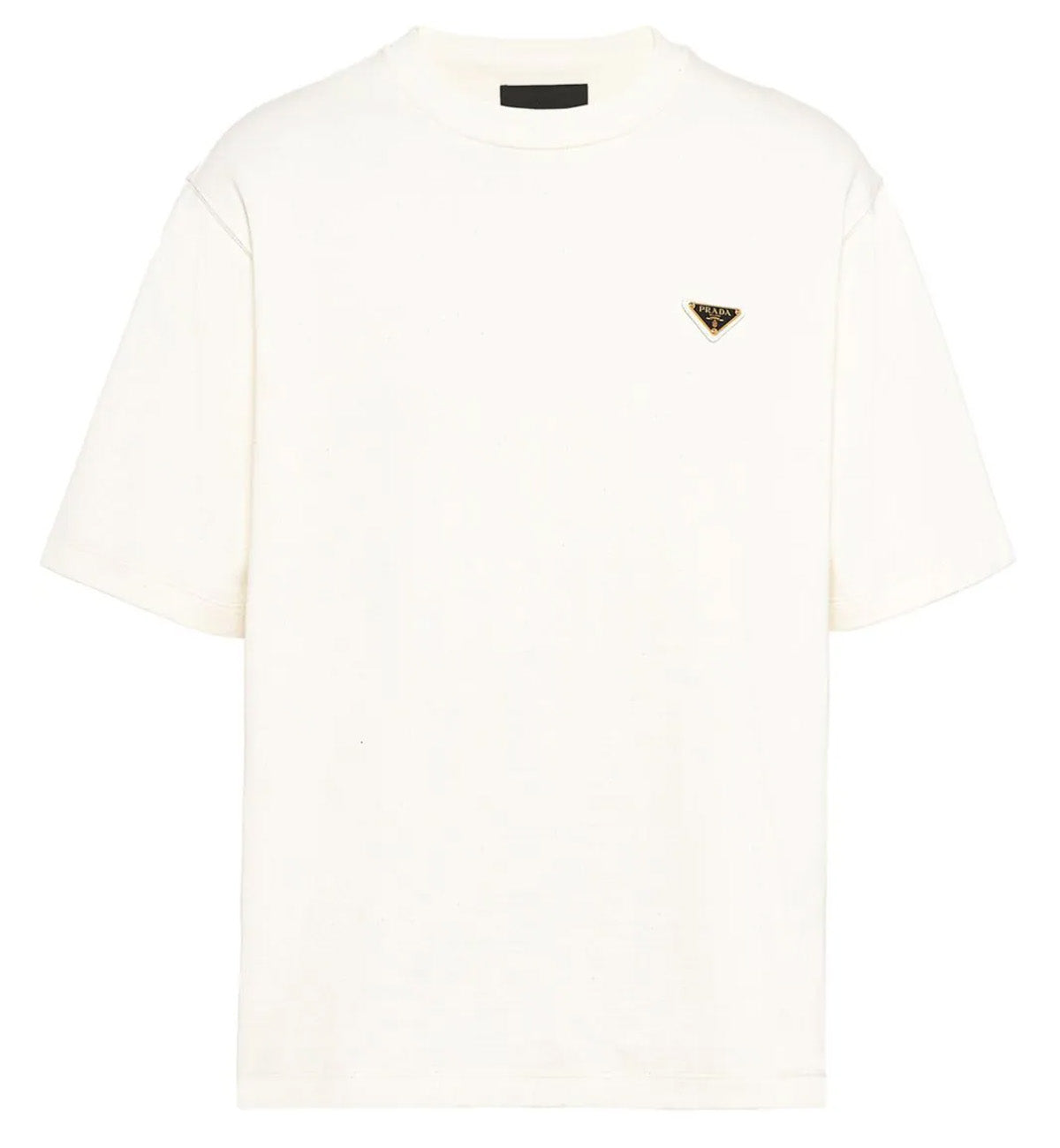 The Prada Triangle Logo Cotton T-Shirt in White is the epitome of effortless luxury and understated style. Crafted from premium cotton, this t-shirt offers supreme comfort and a soft touch against the skin. The classic white hue provides a versatile canvas for Prada's iconic triangle logo, subtly embroidered or printed on the chest, adding a touch of sophistication to your casual look.