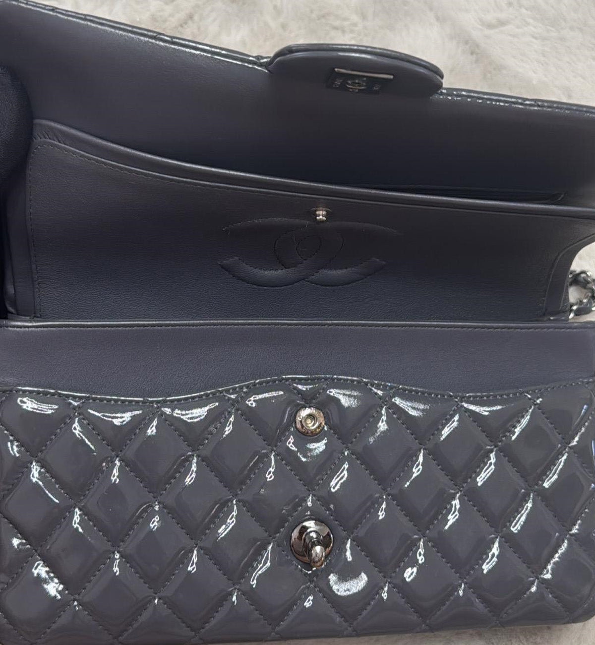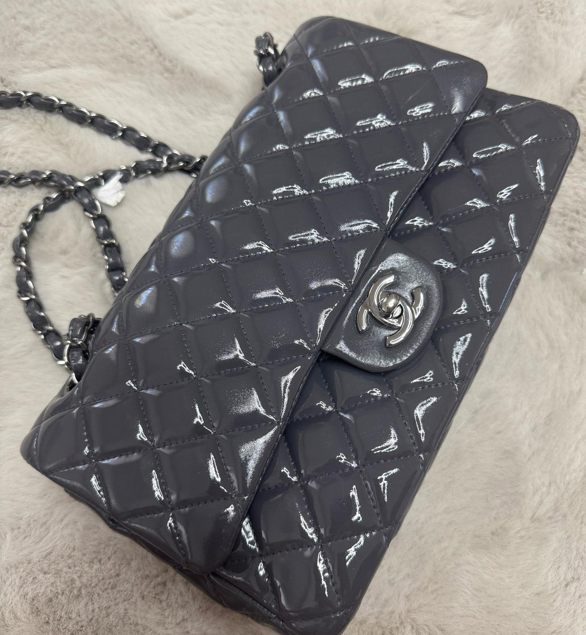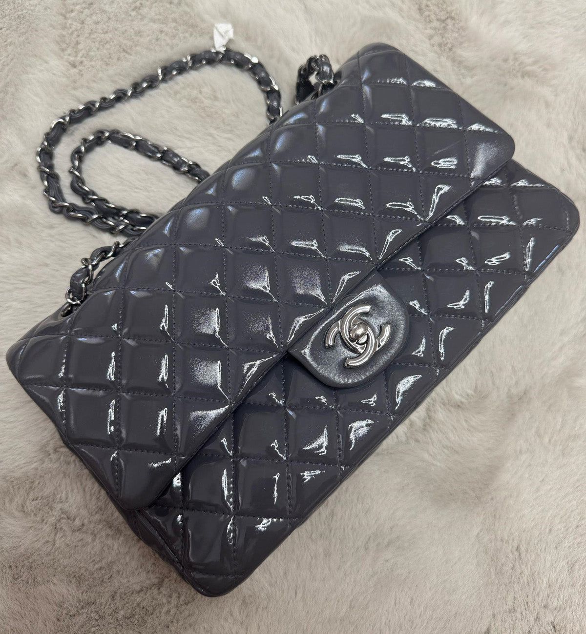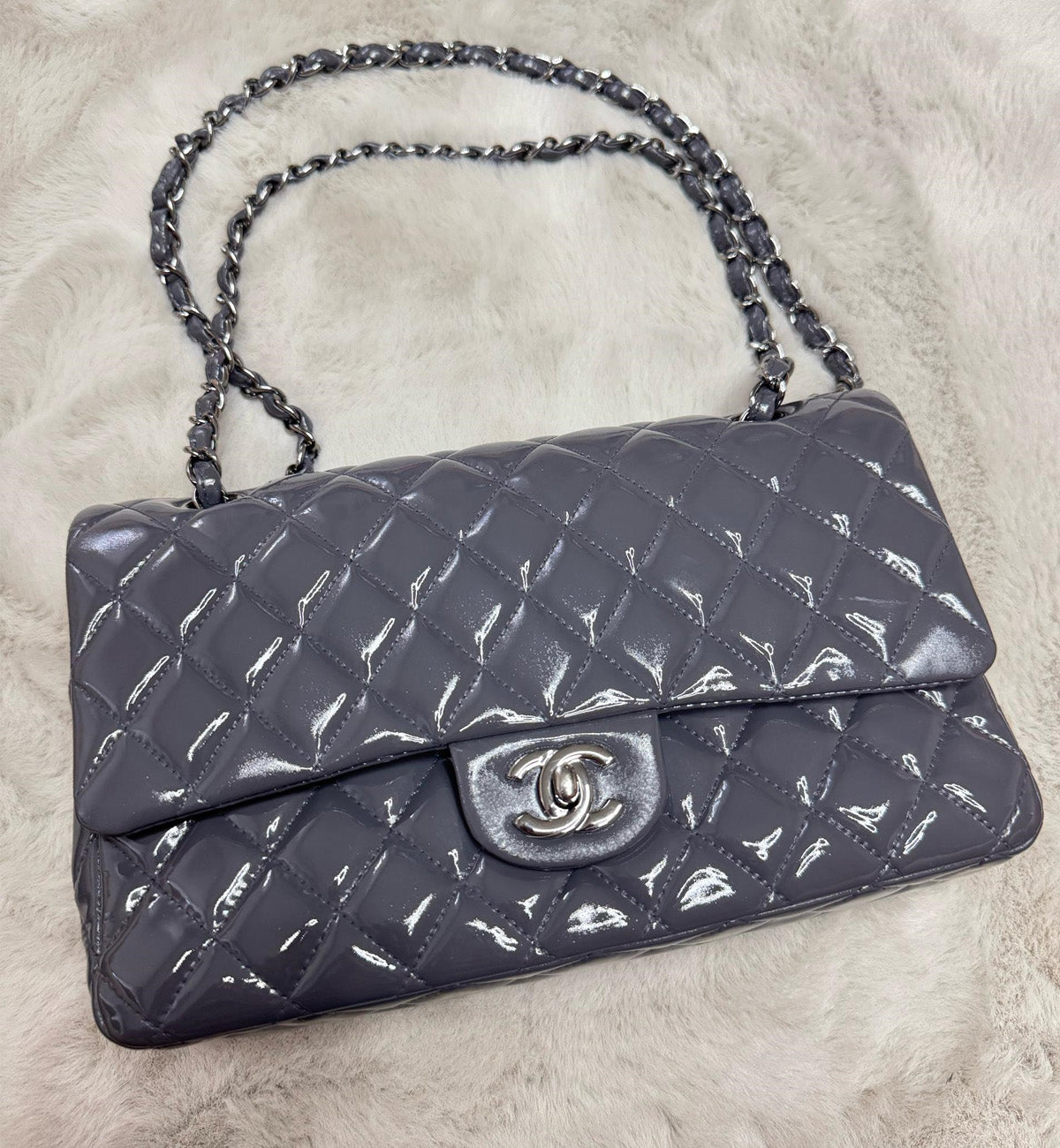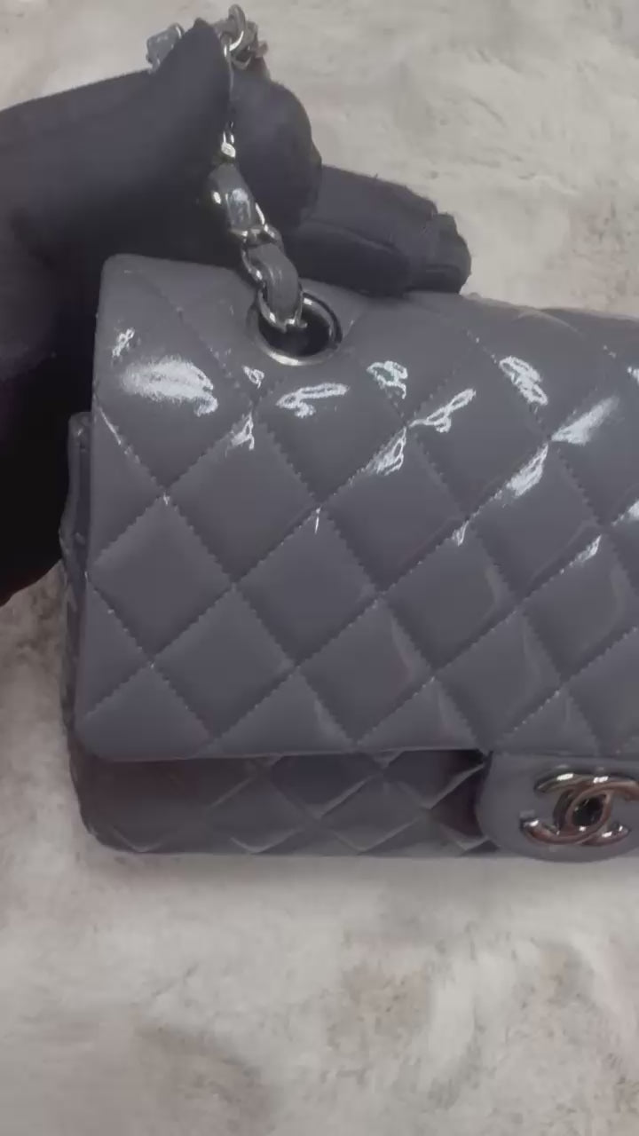 Chanel Double Flap Grey Patent Medium