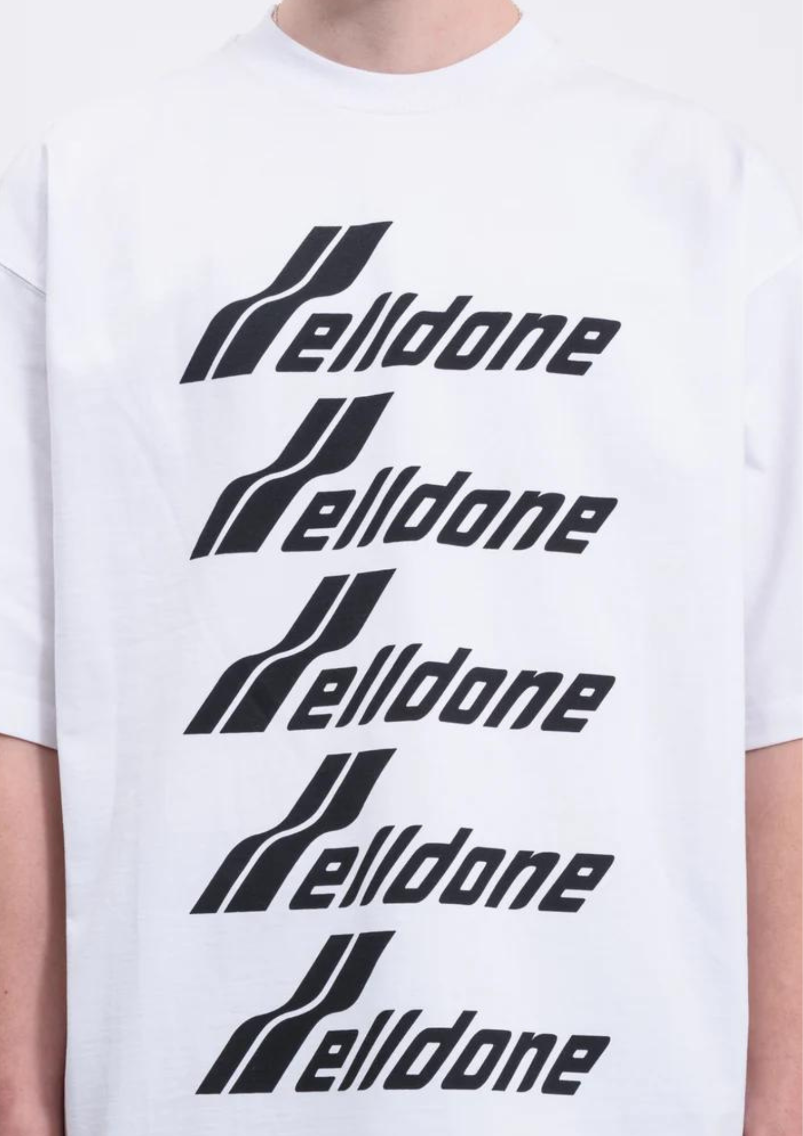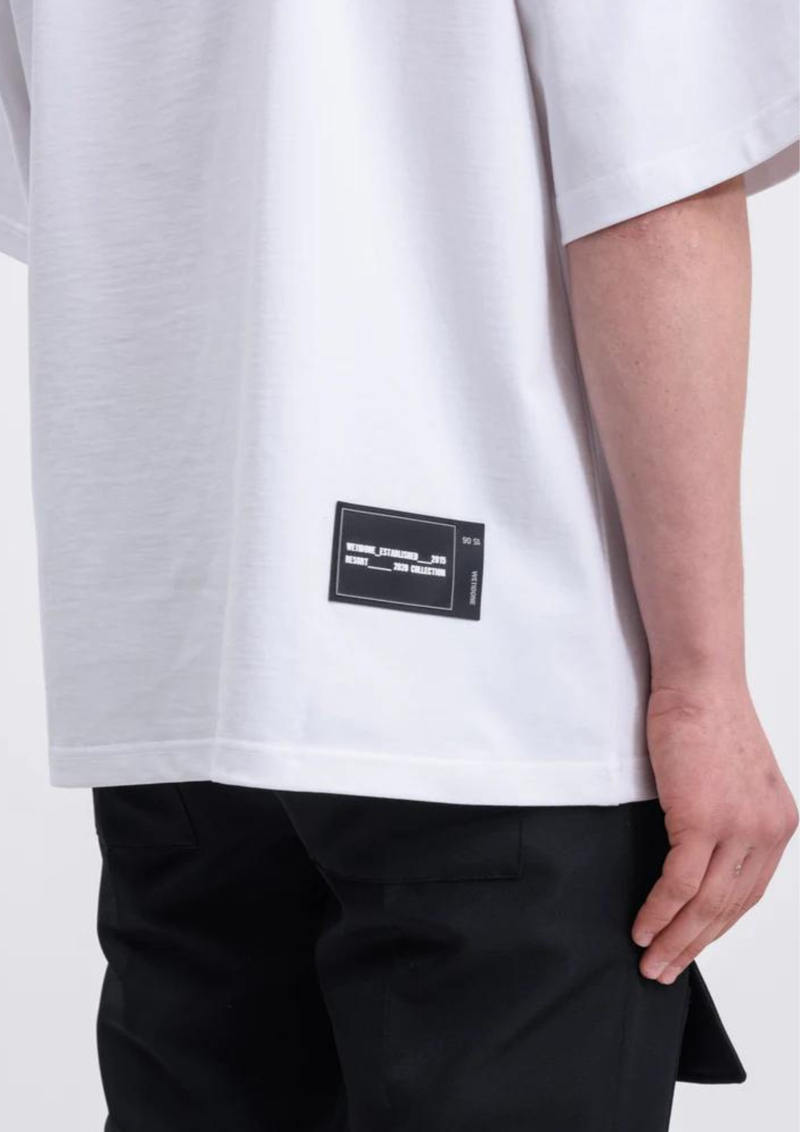 A Short sleeve cotton jersey T-shirt in white suitable for men’s and ladies. Rib knit crewneck collar. Logo printed in reflective silver-tone at chest. Reflective silver-tone piping at armscyes. Rubberized logo patch in black at back hem.