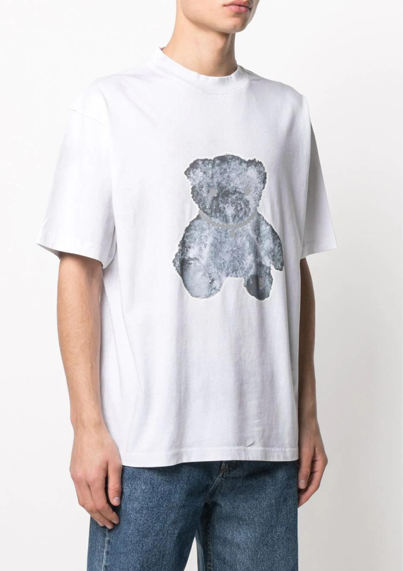 A Short sleeve cotton jersey T-shirt in white suitable for men’s and ladies. A teddy with Pearl Necklace at the front and back.